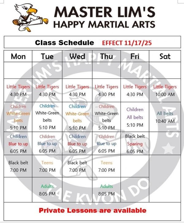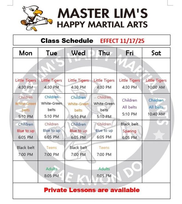 At Master Lim’s Happy Martial Arts, we offer a wide range of Taekwondo classes for all ages and skill levels — from beginners to advanced students. Our programs are designed to build strength, flexibility, and overall fitness while teaching valuable self-defense skills.
